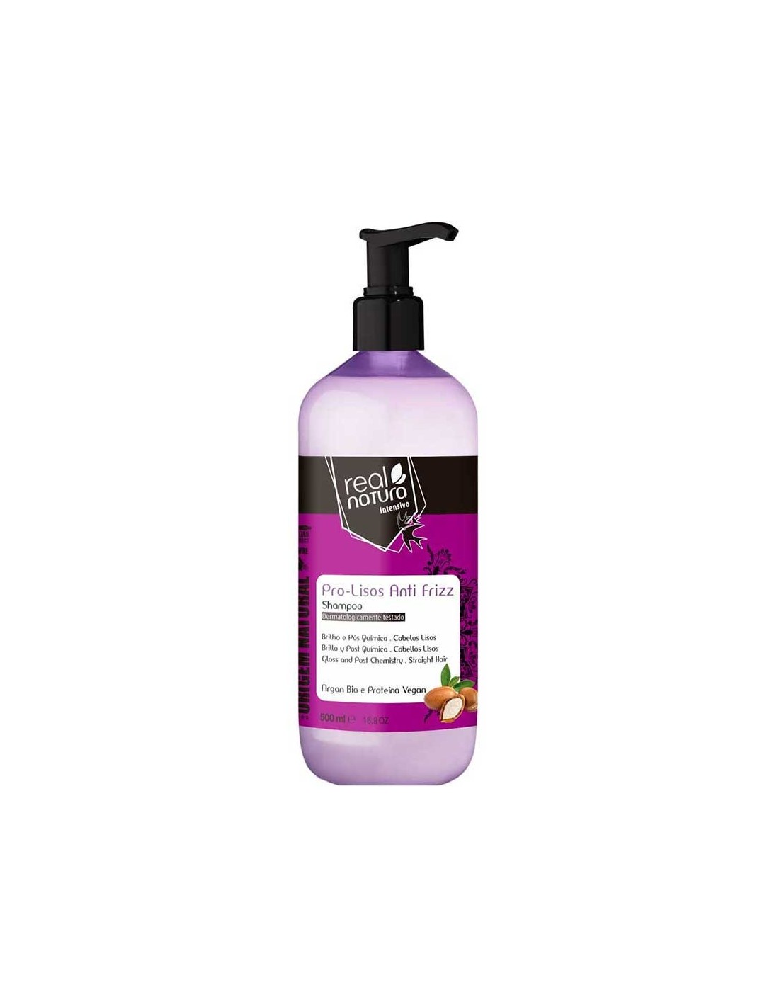 Champú Pro Lisos Anti Frizz de Real Natura que ayuda a mantener el liso, la suavidad y evitar el frizz.