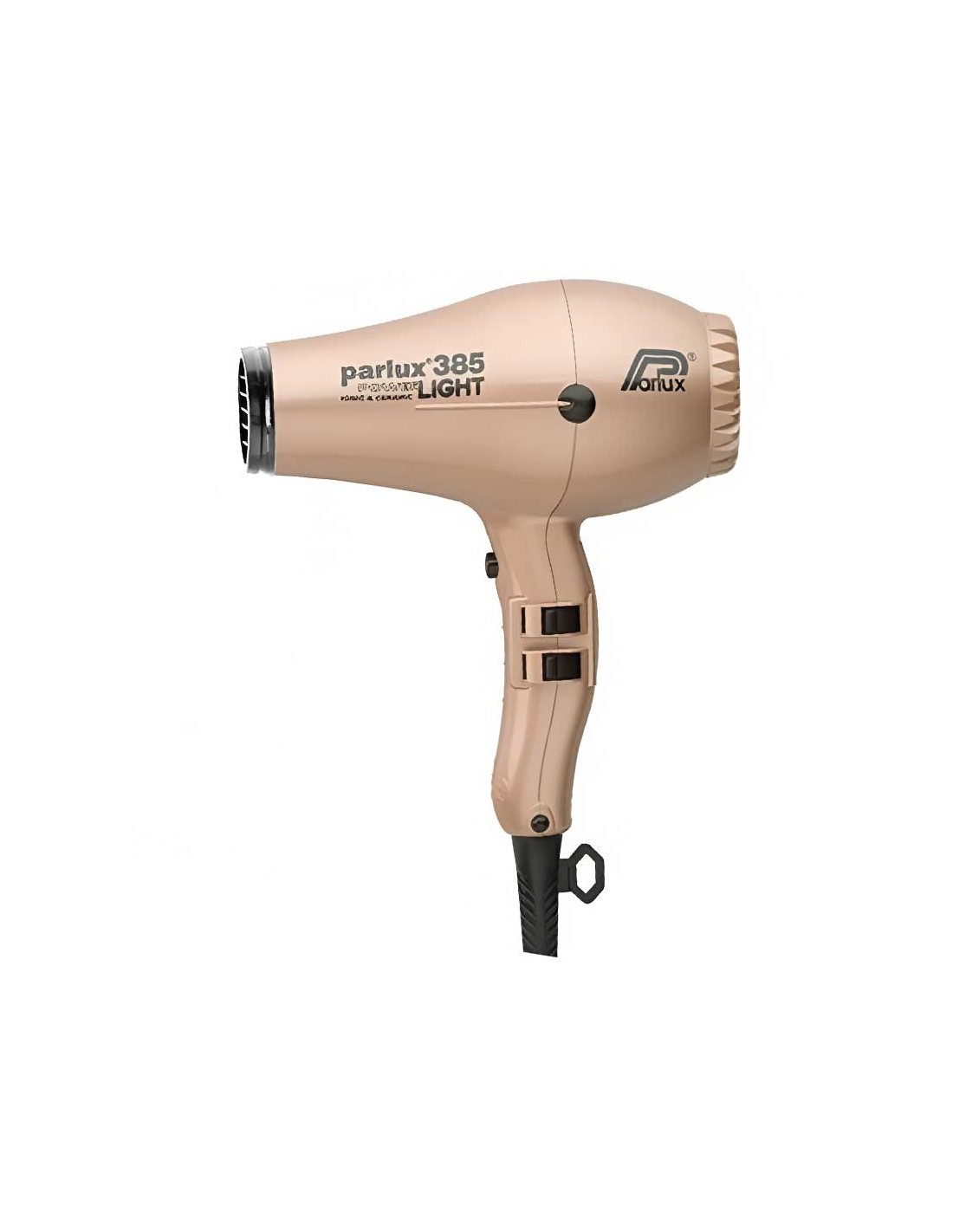 Parlux 385 Powerlight el secador iónico moderno más deseado por las peluqueras. Muy ligero pues solo pesa 425 gramos, tiene un tamaño de 18,5c centímetros y su potencia alcanza los 2.150 vatios. 2 interruptores; 2 velocidades; 2 boquillas; 4 temperaturas con un equilibrado electrónico motor-ventilador con silenciador integrado. Aire frío instantáneo accionado por microinterruptor. Secado súper rápido para ahorrar energía. Ionic cerámic technology Caudal de aire: 79 metros cúbicos/hora. Motor: K-Lamination: - 135 Watt escobillas de 18mm. Duración: 2.200 horas. (Seca durante seis horas al día y responderá como recién estrenado) Resistencia de níquel-cromo encajada y termostato de seguridad. Cable de 3 metros. Ecofriendly: Materias primas reciclables y baja contaminación acústica. Ozono Friendly: Ninguna emisión nociva. Dispone de generador de iones