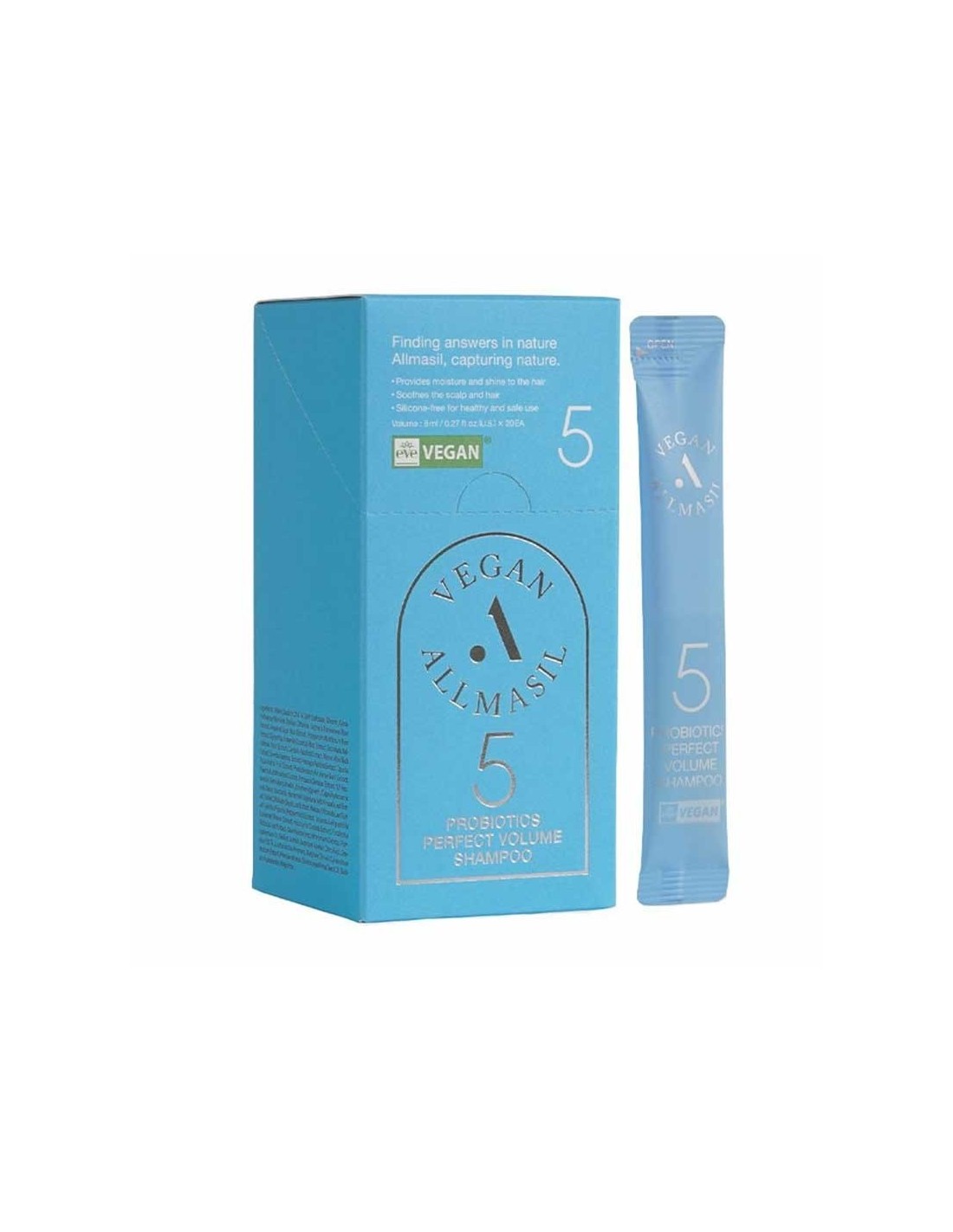 AllmasilLes Stick Pouch Probiotics Perfect Volume Shampoo contiennent un shampooing végétalien avec 5 probiotiques qui favorisent un équilibre sain du cuir chevelu et donnent plus de volume et d’épaisseur aux cheveux.