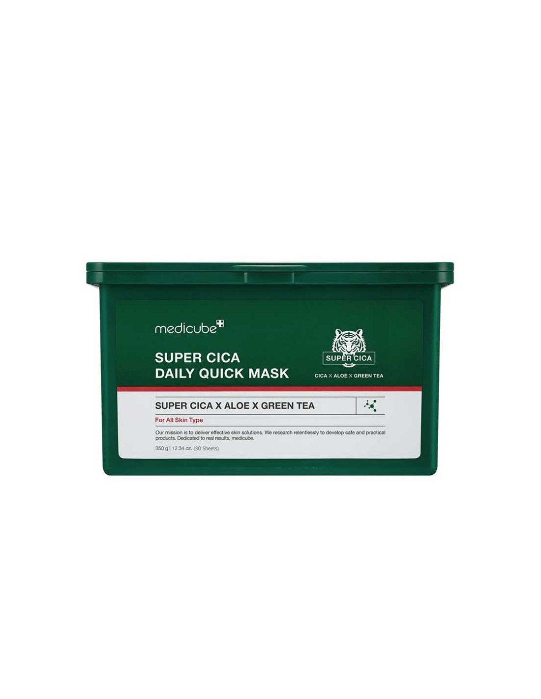 Il se présente dans un paquet de 30 feuilles de masque pour un traitement rapide de 60 secondes ou un soin apaisant de 5 minutes. Sa formule avec aloe vera, thé vert et extrait de pivoine apporte un effet rafraîchissant et antioxydant, tandis que le complexe Cica (Centella Asiatica + Super Cica 7) calme, renforce et protège la barrière cutanée.